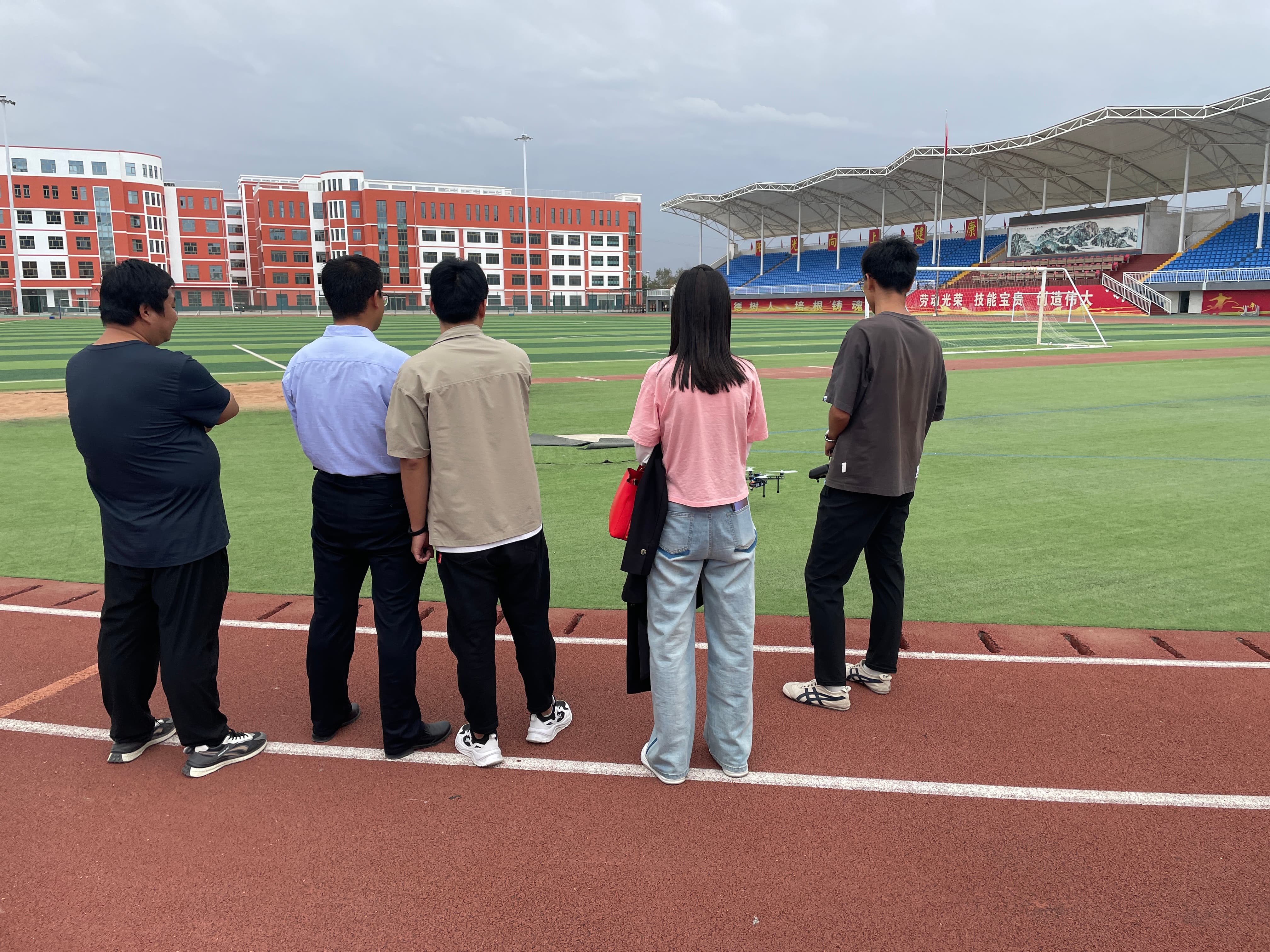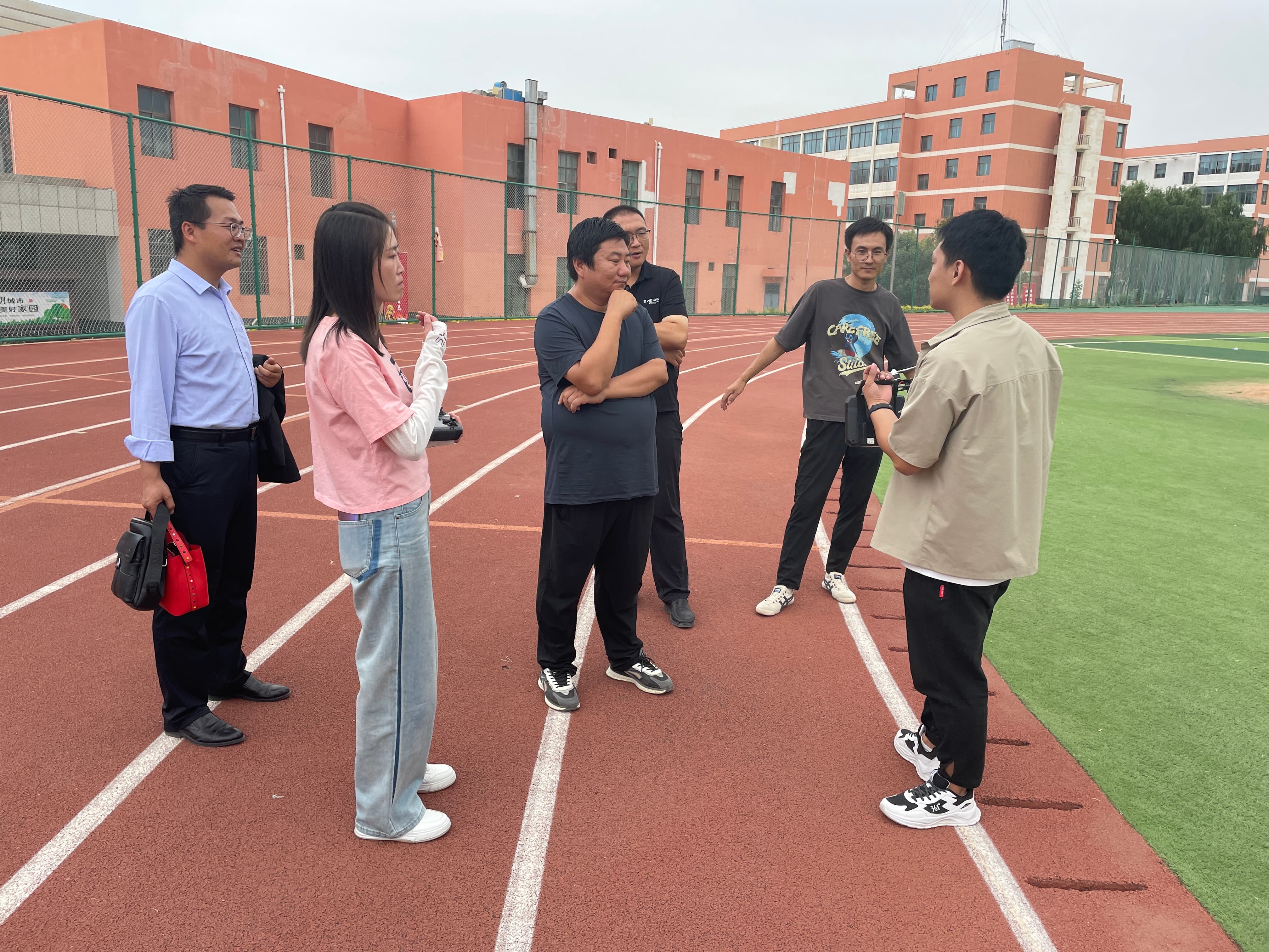 工程師在室外操場講解無人機的飛行原理及遙控器的使用方法