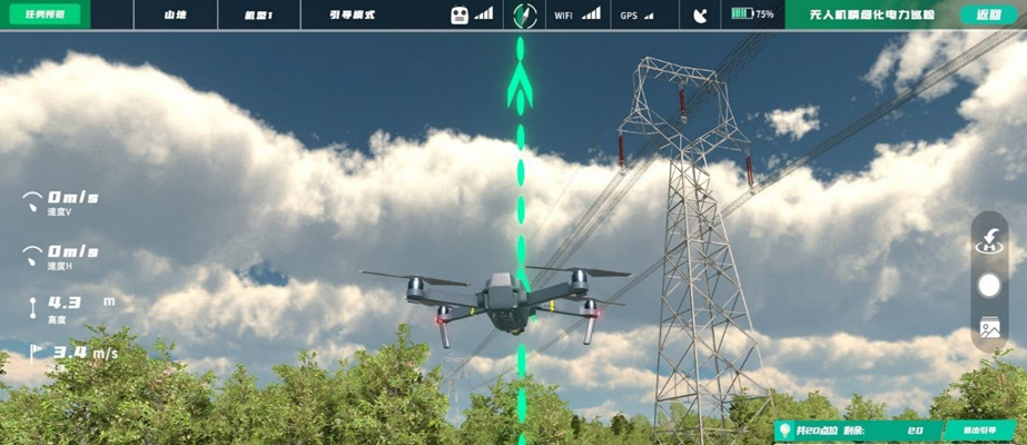 該模塊根據(jù)電力行業(yè)精細(xì)化巡檢標(biāo)準(zhǔn),通過使用無人機(jī)對(duì)高壓電塔進(jìn)行巡檢部位拍攝,以在真機(jī)實(shí)踐前進(jìn)行虛擬仿真培訓(xùn),減少炸機(jī)風(fēng)險(xiǎn),避免飛行時(shí)的安全事故發(fā)生,該模塊具有三種模式,即新手訓(xùn)練、訓(xùn)練模式、考核模式。