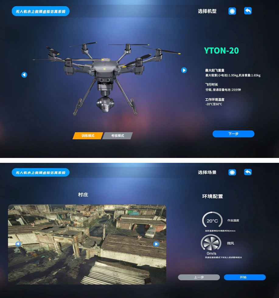 無人機(jī)憑借小巧輕便、高效安全的優(yōu)勢,成為水域救援強(qiáng)有力設(shè)備之一,通過操控?zé)o人機(jī)可將救援設(shè)備高效安全的送達(dá)指定地點(diǎn)以保障受災(zāi)人員的物資補(bǔ)給,該系統(tǒng)通過虛擬仿真還原受災(zāi)場景,通過使用真機(jī)遙控器操控虛擬無人機(jī)進(jìn)行實(shí)戰(zhàn)救援前的訓(xùn)練。