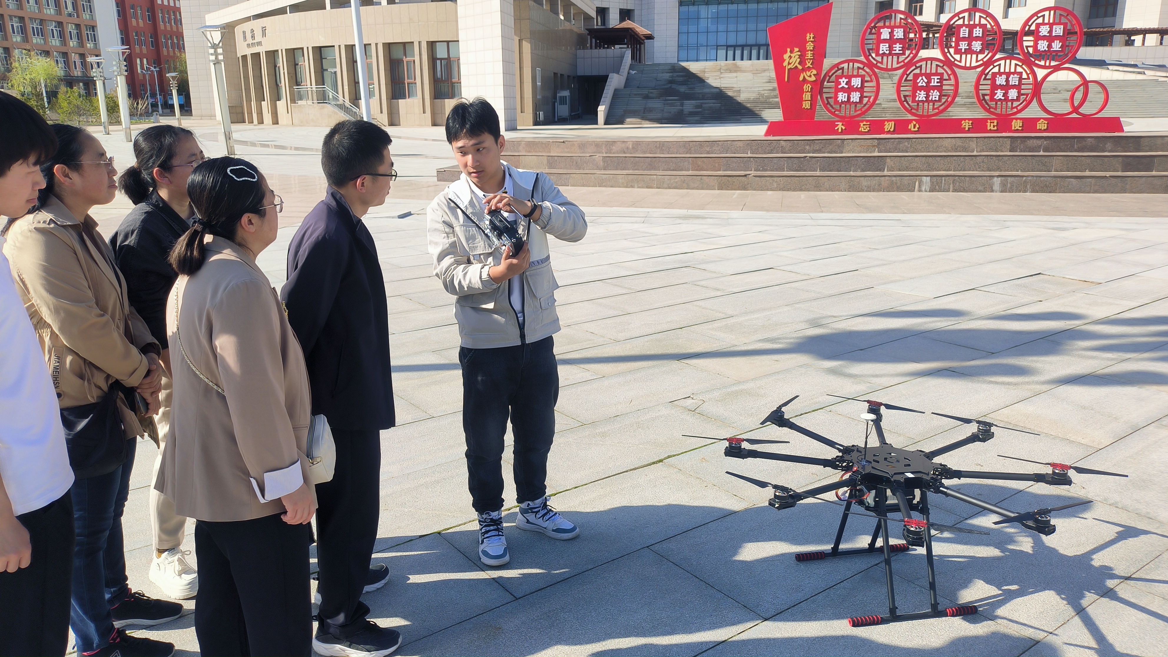 我司工程師在講解八旋翼考證無(wú)人機(jī)飛行操作流程和注意事項(xiàng)