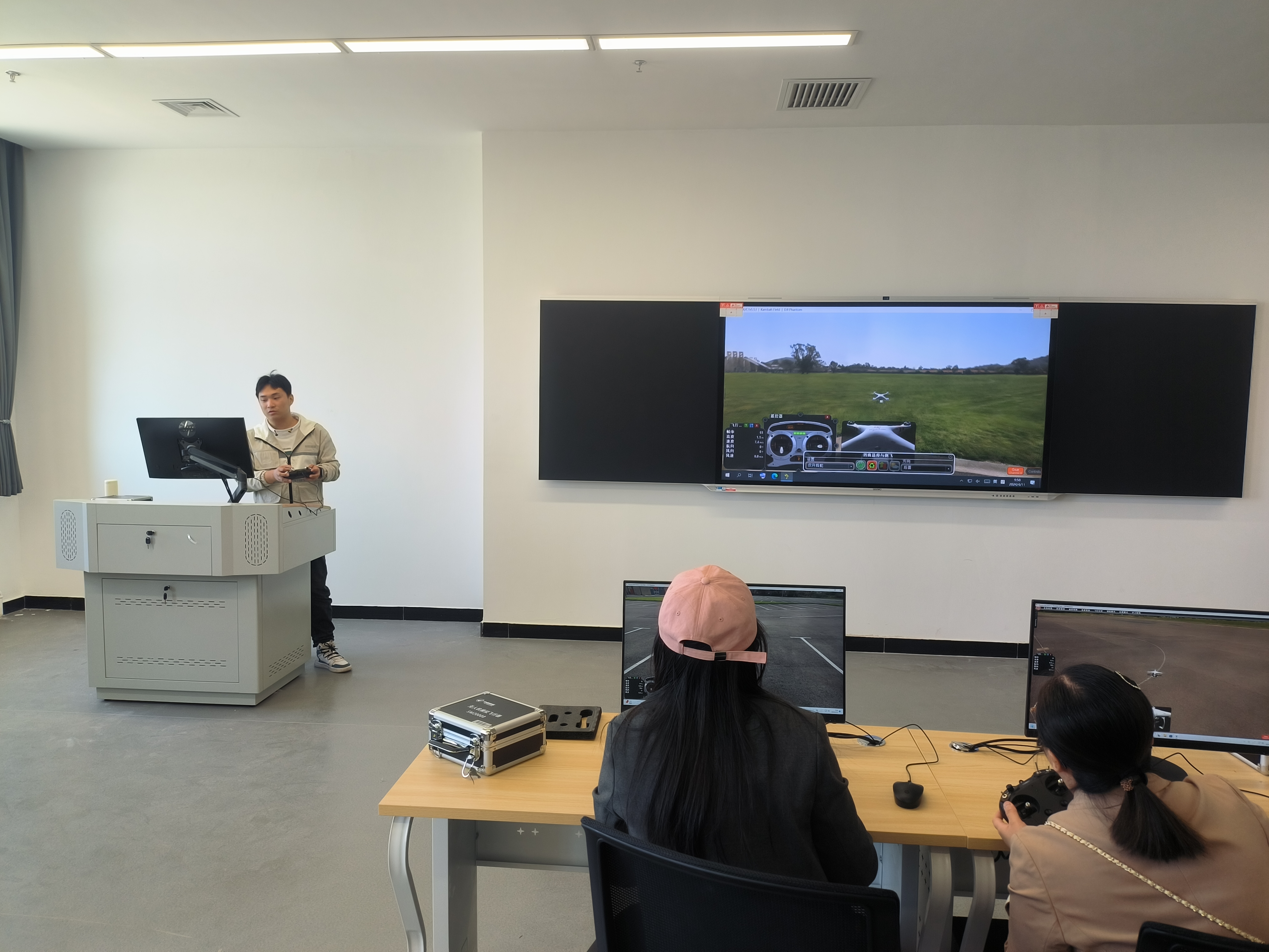中航恒拓工程師于榆林職業(yè)技術(shù)學(xué)院對(duì)無(wú)人機(jī)飛行模擬器進(jìn)行講解。